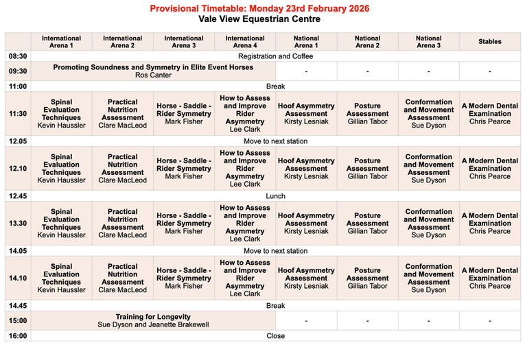 Throughout the day, delegates will gain real-world insights into improving equine and rider symmetry, posture, and soundness. In the afternoon, participants will break into small groups and rotate through a series of practical stations, each focusing on different aspects of assessment and training.